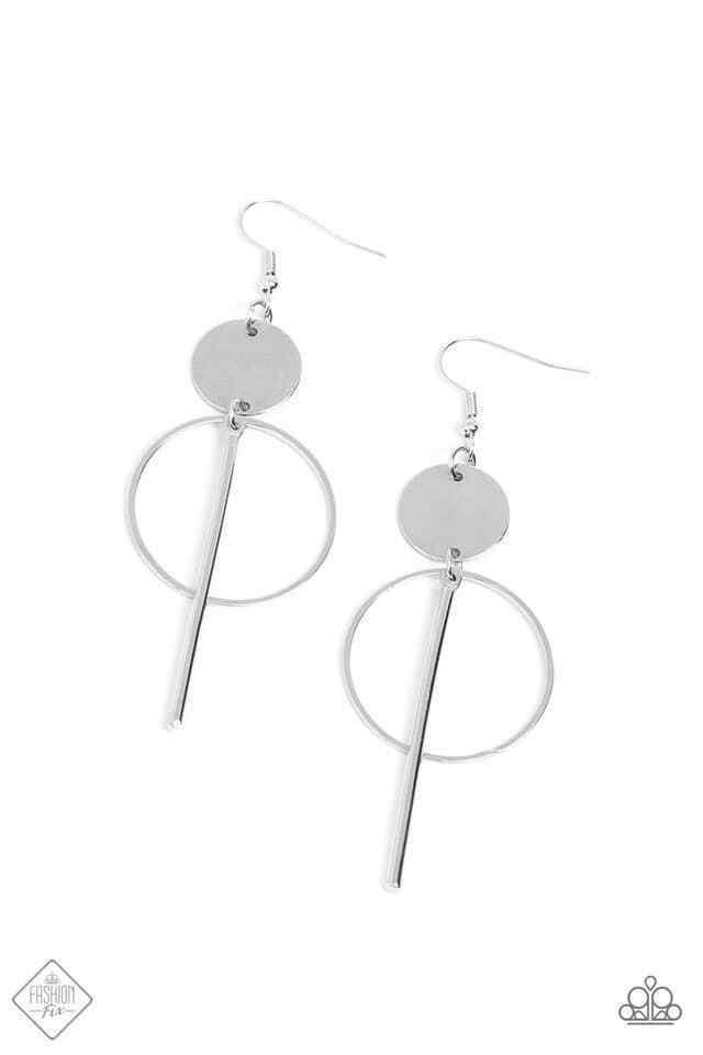A shiny silver disc gives way to a delicate silver hoop and lengthened silver bar that sway below the ear in a fashionably modern display. Earring attaches to a standard fishhook fitting.
