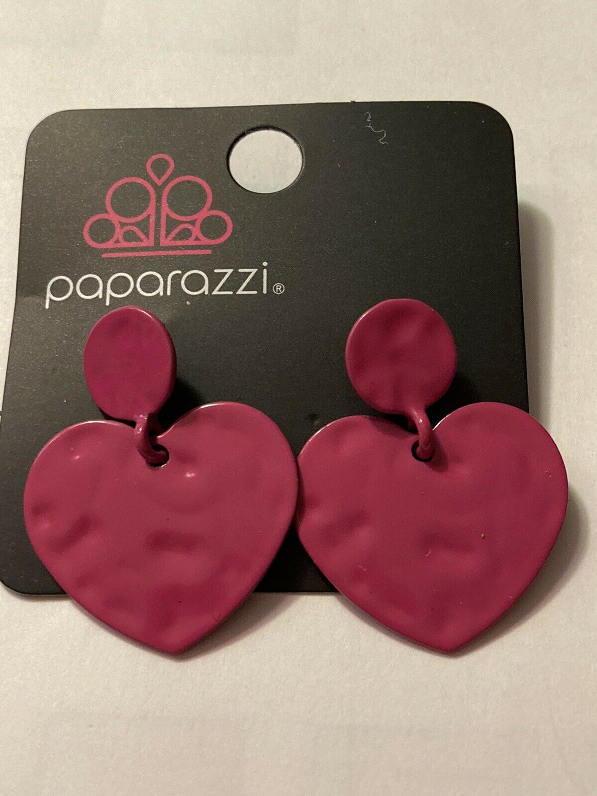 Painted in a glossy Fuchsia Fedora finish, a hammered disc gives way to a hammered heart frame for a flirtatious fashion. Earring attaches to a standard post fitting.