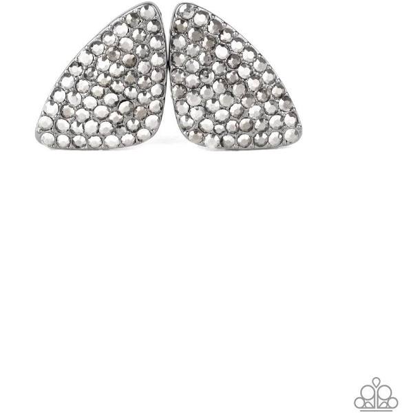The front of a triangular shaped frame is encrusted in row after row of glittery hematite rhinestones for a blinding look. Earring attaches to a standard post fitting.