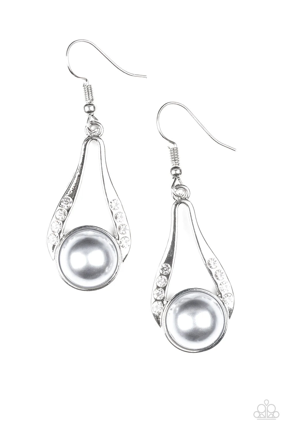A pearly silver bead is nestled along the bottom of an elegant silver frame radiating with glassy white rhinestones for a timeless look. Earring attaches to a standard fishhook fitting.