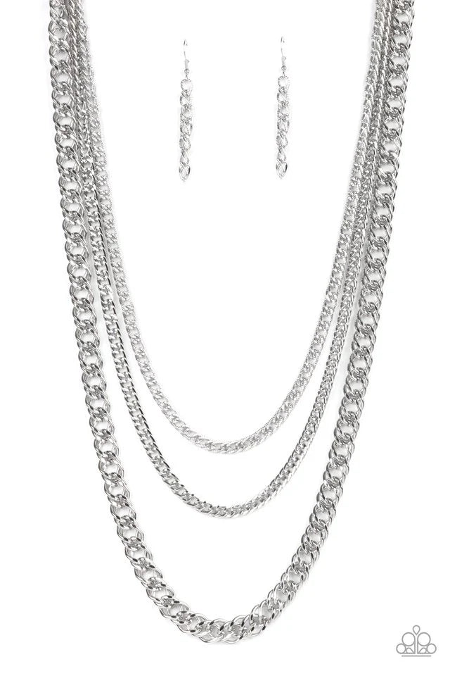 Paparazzi Accessories Necklace: Bold layers of glistening silver chains of varying sizes and textures, fall like a weighty medal across the chest creating an edgy industrial effect. Features an adjustable claspclosure.