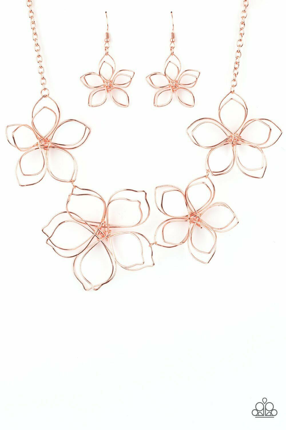 Shiny copper wire delicately twists into oversized blossoms. Varying in size, the airy floral frames delicately link into an asymmetrical display as the layered frames elegantly pop beneath the collar. Features an adjustable clasp closure.