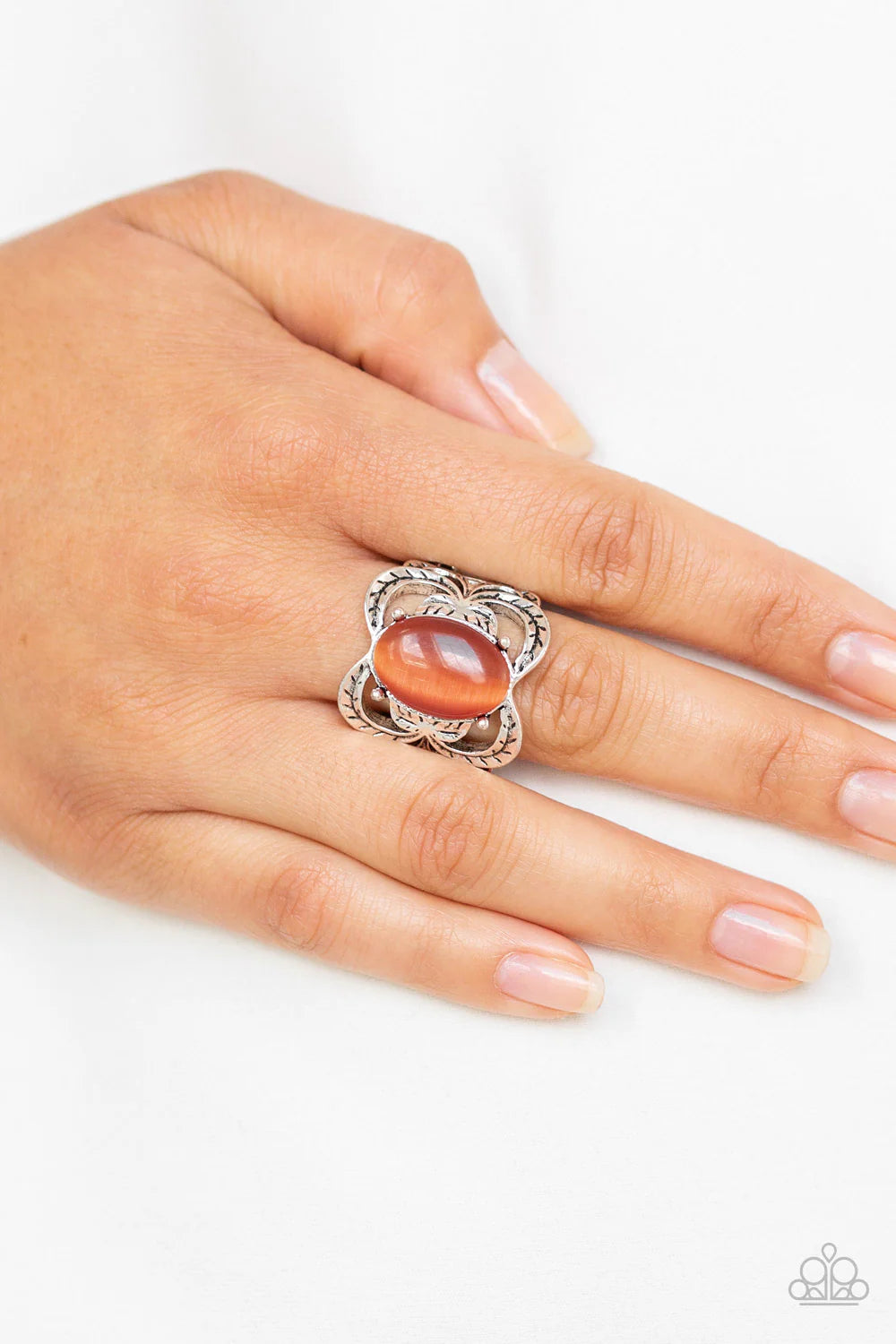 A glowing orange cat's eye stone is pressed into the center of a shimmery silver frame etched in leafy details for a whimsical look. Features a stretchy band for a flexible fit.