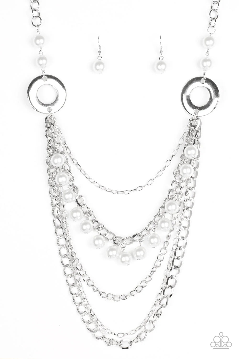 Dramatic silver hoops give way to layers of mismatched silver chains. Pearly white beads trickle from the second chain, creating a flirty fringe across the chest. Features an adjustable clasp closure.