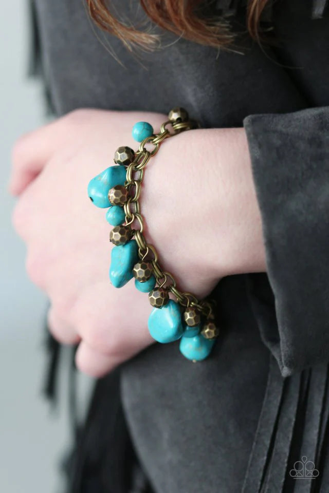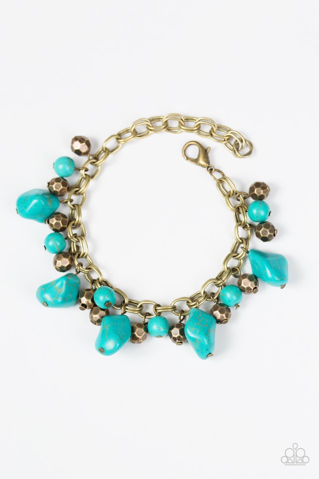 Featuring round and asymmetrical cuts, refreshing turquoise stones trickle from the bottom of a double chain-linked chain. Faceted brass beads trickle between the stones, adding a splash of metallic shimmer to the earthy fringe. Features an adjustable clasp closure. Sold as one individual bracelet.