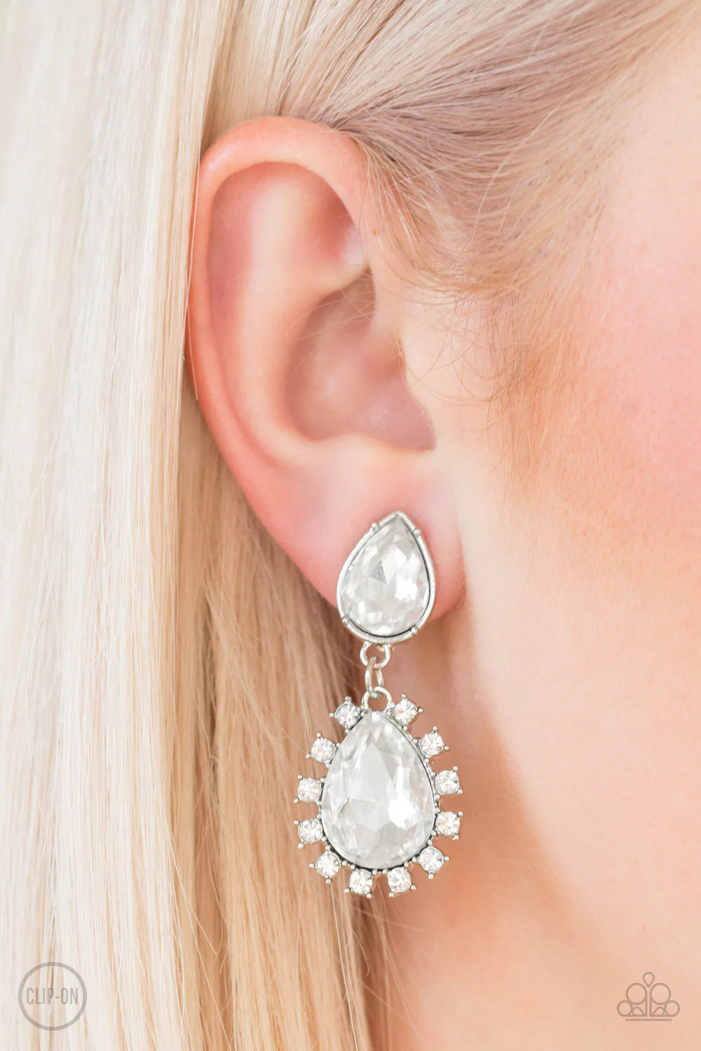 Framed by dainty white rhinestones, a dramatic white teardrop gem swings from a slightly smaller teardrop gem, creating a breathtaking lure. Earring attaches to a standard clip-on fitting.