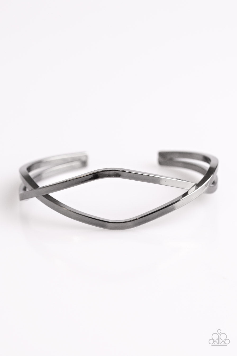Brushed in a glistening finish, shiny gunmetal bars crisscross across the wrist, creating a sleek cuff.